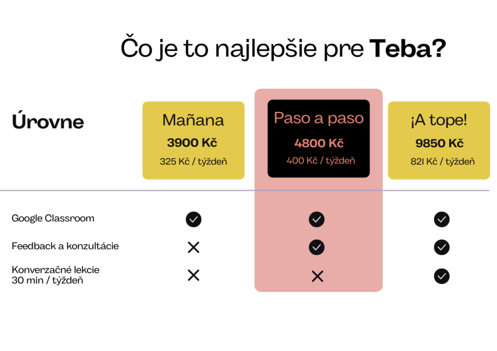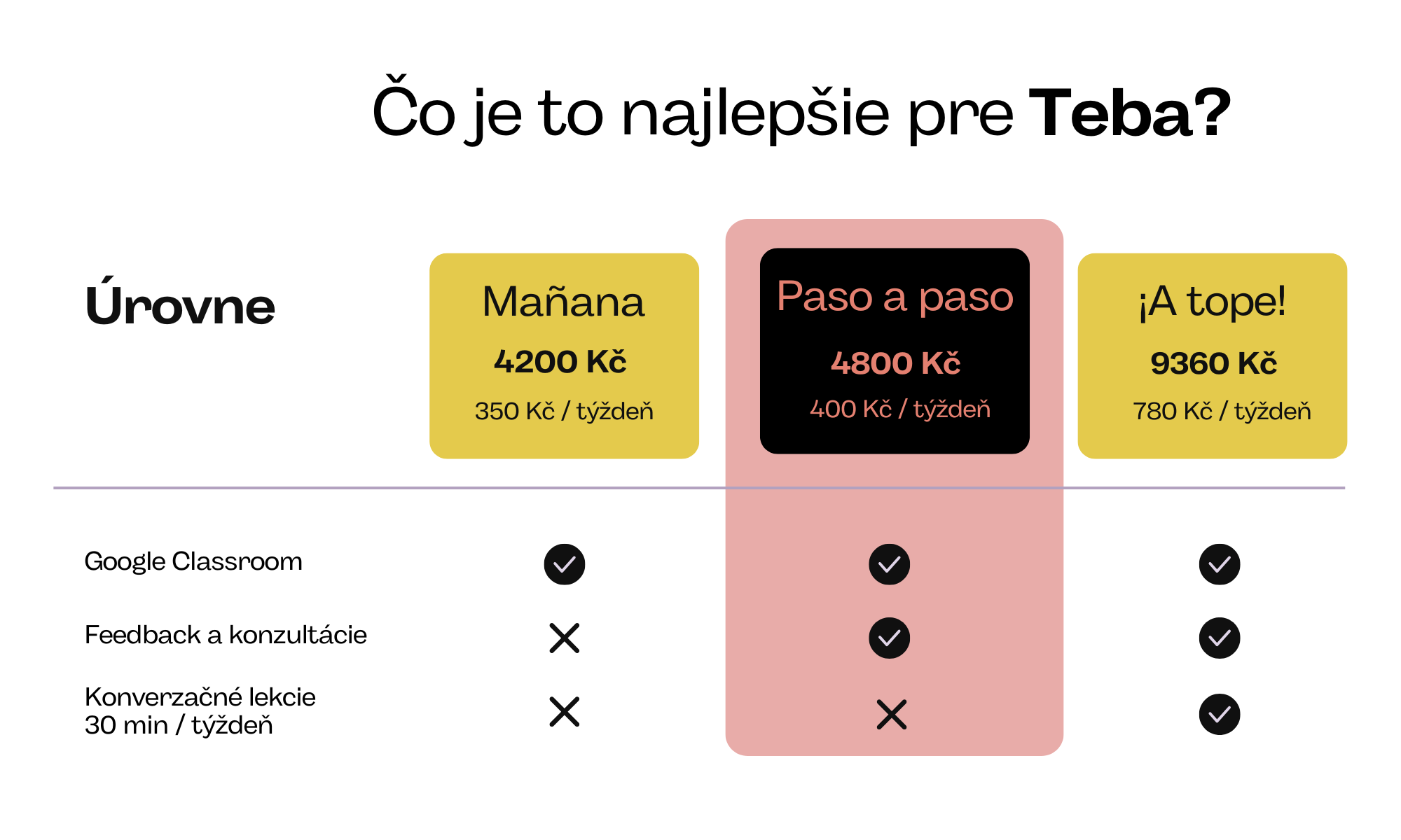 Chceš ísť do španielčiny naplno? Vyber si úroveň ¡A tope! (Na plný plyn!) a k základnému kurzu získaš aj 30 minútové konverzačky so mnou každý týždeň. Táto možnosť nie je dostupná vždy, keďže závisí od mojich časových možností, preto ak ťa zaujala, napíš mi a dám ti vedieť.